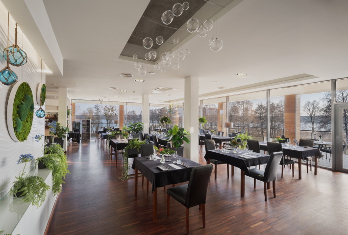 Panoramicznie przeszklone i luksusowe wnętrza Restauracji Panorama w Hotelu Moran **** SPA zapewniają niepowtarzalny widok na jezioro Powidzkie.